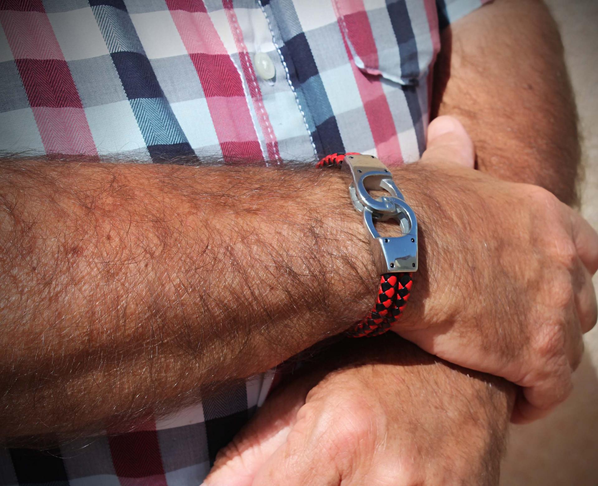Chrissie C has designed and crafted a pretty sexy totally unisex bracelet using a "handcuff" theme and combining 2 strands of an interwoven black/red design genuine leather.