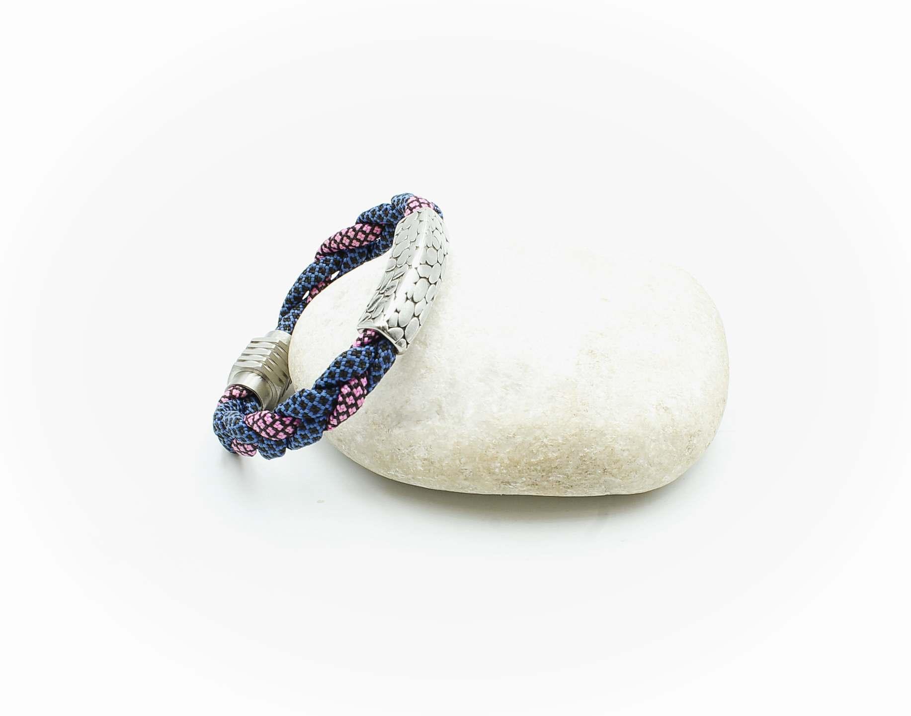We have used 3 pieces of our 4mm, cotton paracord that has a waxed finish. In the images, we have used 2 pieces of the blue and woven one strand of pink cord into the plait. We then added a stainless steel crocodile effect spacer for a unique custom design from Chrissie C.